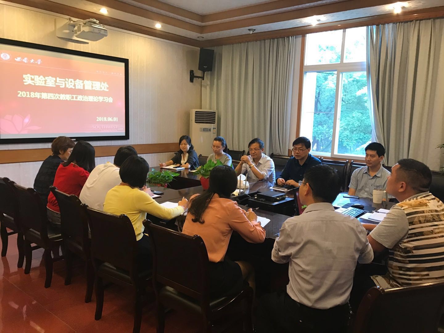 根据学校的安排部署,6月1日下午,实验室与设备管理处在南区行政楼0218会议室举行2018年第四次教职工政治理论学习。罗书强副处长主持学习活动,实验室与设备管理处全体人员参加。