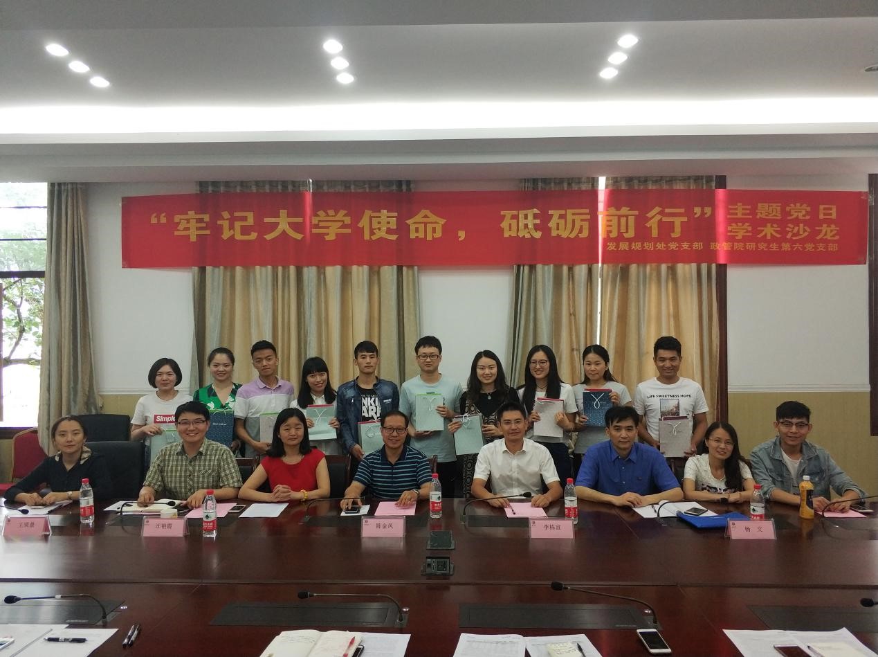 6月8日下午,发展规划处党支部与政治与公共管理学院研究生第六党支部在政管院3328会议室组织开展主题为“牢记大学使命,砥砺前行”的党日活动暨学术沙龙活动,政治与公共管理学院党委书记李栋宣、发展规划处处长杨文、政治与公共管理学院党支部书记汪艳霞、发展规划处党支部副书记王荣景以及两支部的成员参会,会议由发展规划处党支部书记、发展规划处副处长陈金凤主持。